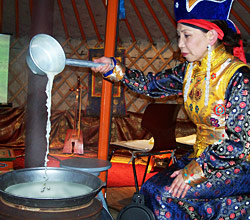 Erleben Sie die Tee-Zeremonie in der Jurte hautnah. Der Tee wird nach der mongolischen traditionellen Art auf dem Jurtenofen zubereitet, welcher aus wilden Kräutern und grünen Teeblätter besteht, die im Norden der Khöwsögöl Region wachsen. Dieser Tee wird als gesalzener Milchtee bezeichnet. So befremdend das klingen mag, so gut kann es in der Realität schmecken.